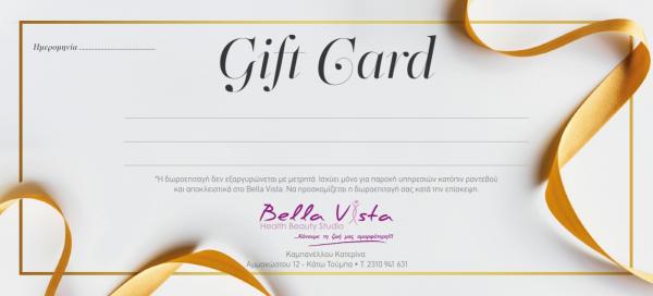 Χαρίστε στα αγαπημένα σας πρόσωπα σε γιορτές , γενέθλια και επετείους ή ως ένδειξη φιλίας και αγάπης μια Gift Card από το Bella Vista. Μπορείτε να προεπιλέξετε κάποια ή κάποιες υπηρεσίες από το μενού, όπως μασάζ, θαλασσοθεραπεία, ενυδάτωση προσώπου, ή να χαρίσετε το ποσό που επιθυμείτε. Τη δωροεπιταγή μπορεί να την εξαργυρώσει σε όποια υπηρεσία επιθυμεί ή να αγοράσει προϊόντα skincare από κορυφαία brands. Ένα ξεχωριστό δώρο... ένα δώρο πολυτελείας, χαλάρωσης και αναζωογόνησης!